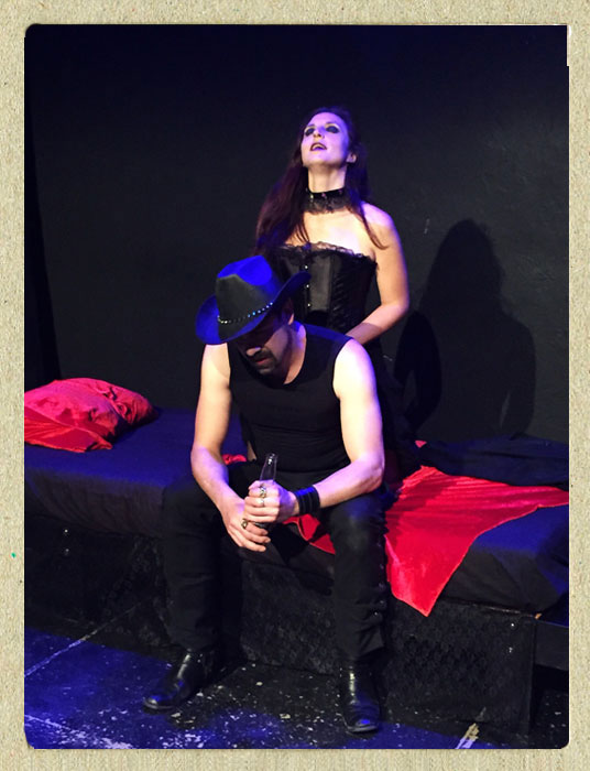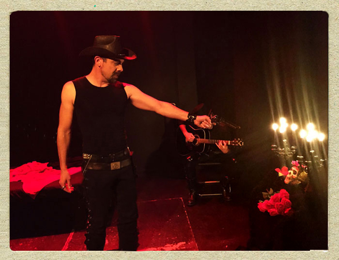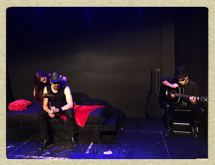 "Santa Muerte", una pieza de mitoteatro escrita y dirigida por Christian Märtens, nos narra el encuentro entre estos dos personajes al límite, jugando con los tiempos y con sus elipsis, espacios indefinidos que aderezan los arpegios de un oscuro guitarrista. El texto y la acción discurren como un sueño, como las estrofas desordenadas de un poema cuyo ritmo galopa entre la melancolía y un metalenguaje canalla. El movimiento, la interacción entre los personajes, las intervenciones de la guitarra, el altar a un lado de la escena... Son los elementos místicos de un mismo ritual. Todo para encontrarse cara a cara con esa deidad del sincretismo mexicano que, entre oraciones y susurros, se levanta de entre los difuntos bajo el apelativo de Santa Muerte.