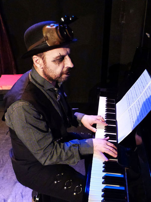 El piano, un revólver. La introducción musical, voces, coros, cadencia salvaje. Un texto que se mueve espasmódicamente entre el absurdo y la crueldad, la atmósfera envuelta en un traje retro futurista y la voz de la radio, esa voz que tomará una forma omnipresente, introducen al público en la historia de este dark cabaret; un burdel, cuatro prostitutas, un proxeneta y dos canallas forman el cuadro sobre el que cae, como una tormenta repentina, la anunciación del fin del mundo. Escondidos durante diez días en esa casa del pecado que se convertirá en su refugio, con objeto de esperar a que pase lo peor, los personajes de “El Decamerón de las Sombras” intercambiarán relatos, canciones, historias a veces fantásticas y a veces descarnadamente reales. Se torturarán mutuamente, invocarán a sus fantasmas y se irán conociendo para acabar descubriéndose a sí mismos, en un crescendo que conducirá ese apocalíptico final, que, de algún modo, cabía esperar. A fin de cuentas, un viaje hacia el desastre y la locura conducido por el humor negro.