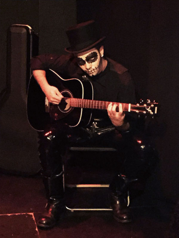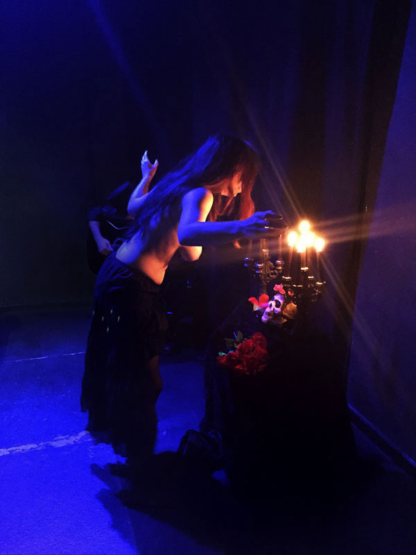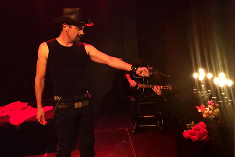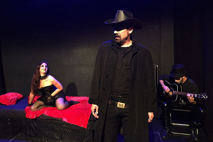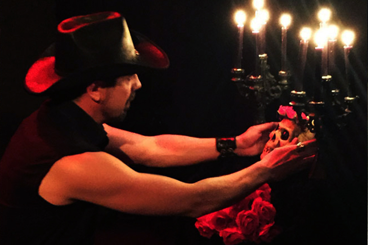 "Santa Muerte", una pieza de mitoteatro escrita y dirigida por Christian Märtens, nos narra el encuentro entre estos dos personajes al límite, jugando con los tiempos y con sus elipsis, espacios indefinidos que aderezan los arpegios de un oscuro guitarrista. El texto y la acción discurren como un sueño, como las estrofas desordenadas de un poema cuyo ritmo galopa entre la melancolía y un metalenguaje canalla. El movimiento, la interacción entre los personajes, las intervenciones de la guitarra, el altar a un lado de la escena... Son los elementos místicos de un mismo ritual. Todo para encontrarse cara a cara con esa deidad del sincretismo mexicano que, entre oraciones y susurros, se levanta de entre los difuntos bajo el apelativo de Santa Muerte.